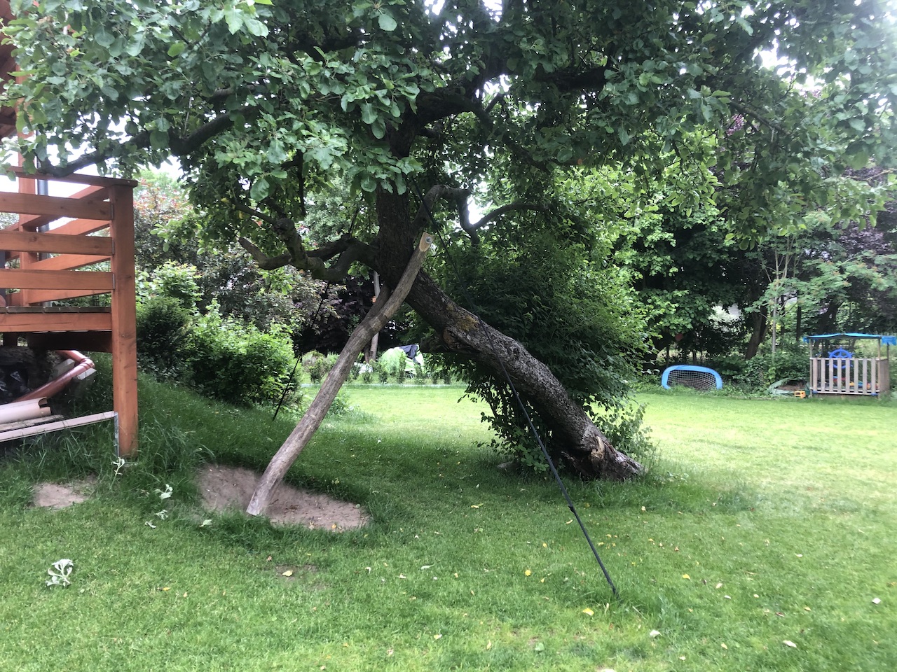 Obstbaum Stützsystem ← Previous Next → Die vitale Krone mit prächtiger Blütenpracht im Frühling und reicher Apfelernte im Herbst wäre zu schwer für den schrägstehenden Stamm. Da musste eine Stütze her. Erfolgreicher Erhalt des schönen, alten Baumes in Hamburg.